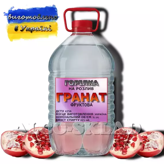 Фруктовая водка «Гранат» 40% — насыщенный вкус граната и мягкое послевкусие в удобной ПЭТ-бутылке 5 л с пломбой первого вскрытия. Производится в Украине, соответствует ДСТУ 4256:2021. Подходит для банкетов, баров и коктейлей. Доставка Новой почтой по всей Украине.